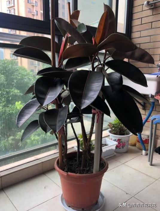 第4种就是我们知道的橡皮树,橡皮树大家应该不陌生吧,它的叶片长得非常的大,颜色黝黑,而且主干粗壮,它对土壤不挑,对水分也是需求量比较小的,比较耐干旱,比较耐贫瘠,我们养护的环境尽量多给他见光照,如果见光少的话,保证着盆土干透,隔个一两天再给他浇水,肥料一个月给他用一次,定期用喷壶喷一下叶片,就能够保证他长得非常的好,而且他对空气中的灰尘吸附有一定的作用,而且还能够吸收二手烟,养它的话是非常好的。